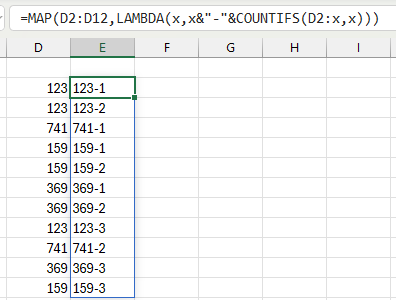 =MAP(D2:D12,LAMBDA(x,x&"-"&COUNTIFS(D2:x,x))) - ZJacobsmeyer1990Copper Contributor