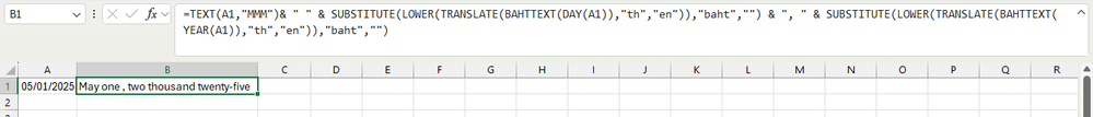 =TEXT(A1,"MMM")& " " & SUBSTITUTE(LOWER(TRANSLATE(BAHTTEXT(DAY(A1)),"th","en")),"baht","") & ", " & SUBSTITUTE(LOWER(TRANSLATE(BAHTTEXT(YEAR(A1)),"th","en")),"baht","")