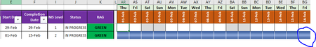 It applies to the whole of the Gantt chart, so the conditional format was keyed against cell AR3 and applies all the way through to QQ103