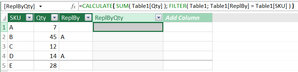 I would expect in the below example that in the column "ReplByQty", the first row would be 45 + 14 = 59. What am I doing wrong? Attached the sample workbook.