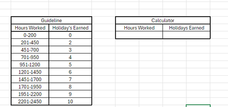 Good Day! I have a set of guidelines for earning bonus days off. (eg. between 251-450hrs earns 2 holiday days) As you can see in the attached pic. I would like to build a calculator that wi...
