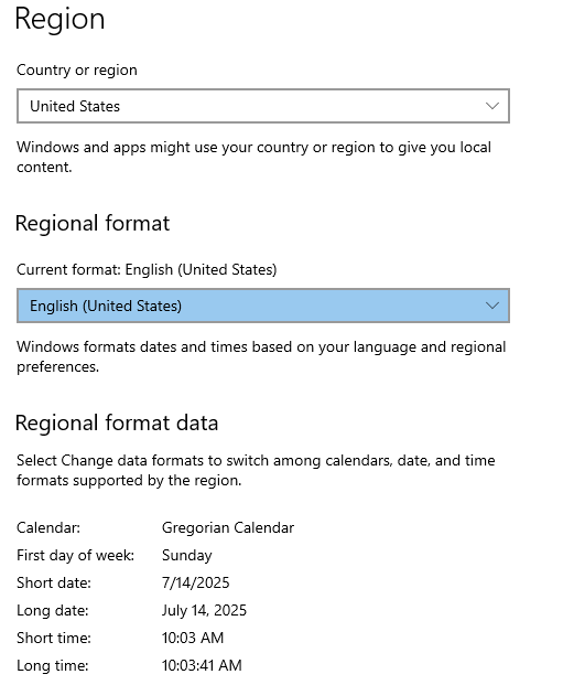 I have Excel from Microsoft 365, installed on my Windows 10 computer. Excel says it's version 2506. I have the regional settings on my computer set to US: