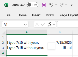 Notice the date formats. When I open a new workbook in Excel, and type a date, if I don't include the year, it immediately converts it to a European format. I type 7/15, and it converts it 15-Jul: