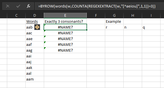 =BYROW(words,LAMBDA(w,COUNTA(REGEXEXTRACT(w,"[^aeiou]",1,1))=3))