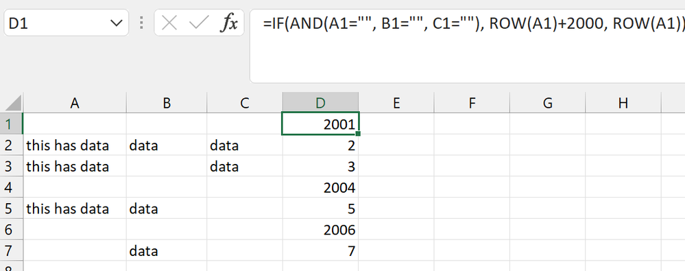 =IF(AND(A1="", B1="", C1=""), ROW(A1)+2000, ROW(A1))