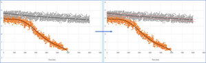 Hello, I have the attached image (left) of more than 45k data points and I want to delete all the points within a range from the trend line to have it like the one on the right side (only the points ...