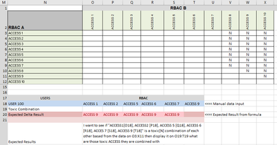 I want to achieve the expected result as shown in the attached image. On the sample, USER 100 has been assigned with different access highlighted in blue. Some of this access are not allowed with a value of "N", Is there a formula that can achieve this outcome? Basically I need display which toxic [N] combination USER 100 has been assigned to. On line 20 that will be the desired outcome.- As shown USER 100 has been given ACCESS 1 that is toxic against ACCESS 9 that is currently assigned on USER 100.