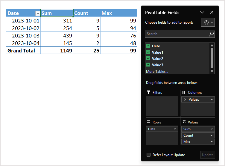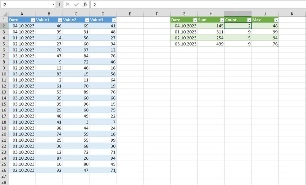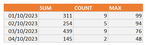 = GROUPBY(Date, Values, HSTACK(SUM, COUNT, MAX), , 0)gives the desired results, sorted by date.