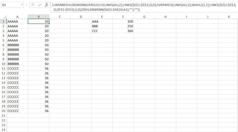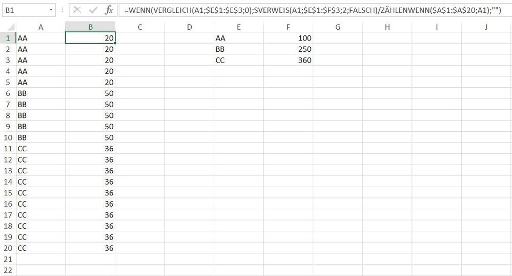 =IFERROR(IF(MATCH(LEFT(A1,2),LEFT($E$1:$E$3,2),0),VLOOKUP(LEFT(A1,2),CHOOSE({1,2},LEFT($E$1:$E$3,2),$F$1:$F$3),2,0)/COUNTIF($A$1:$A$20,A1),""),"")You can try this formula. Enter the formula with ctrl+shift+enter if you don't work with Office365 or Excel 2021. This suggestion is with VLOOKUP and CHOOSE however it should be easier with INDEX and MATCH.