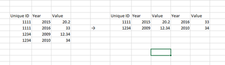 Thank you very much for responding and for taking the time to provide an example. Unfortunately the years aren't always the following year (e.g. 2008 then 2009) so sometimes the unique ID has a value from 2008 then the next in 2012. So it doesn't matter if the years are not after one another as long as they are chronological ... Here is the example but with years not necessarily 2008,2009,2010 etc so it needs to look like the rows shown on the right.