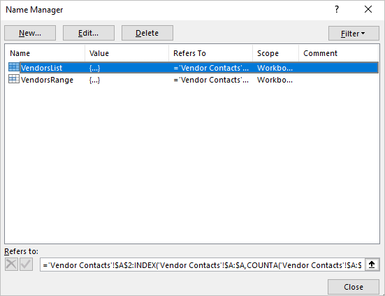 ='Vendor Contacts'!$A$2:INDEX('Vendor Contacts'!$A:$A,COUNTA('Vendor Contacts'!$A:$A))and another for vendor info range
