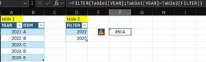 =FILTER( Table1, COUNTIF(Table2[Filter], Table1[Year]), "no data" )