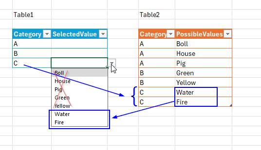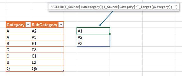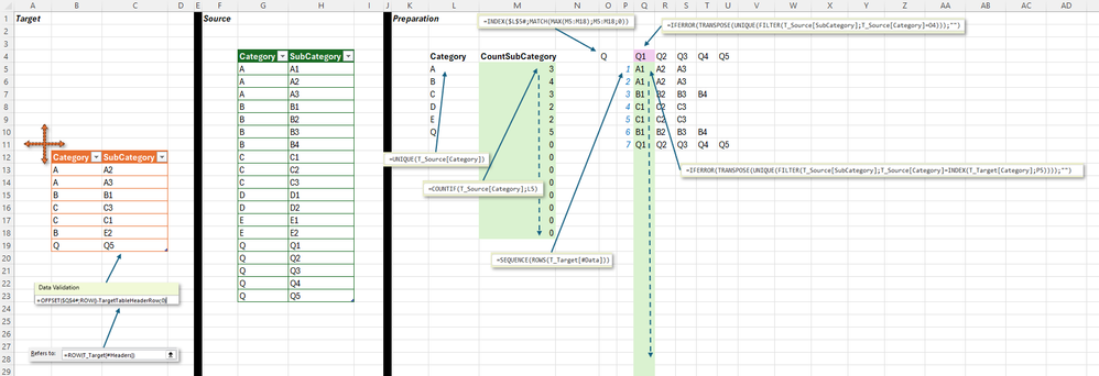 Thanks! :) I like the approach in 1. where I can keep all category values in one and the same list/table. I'll try to find the best way to make the "help sheet" 'INDIRECT' to keep up with formulas when the target table growth.