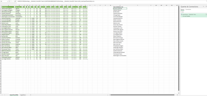 I also have a page that lists all 32 NFL teams so that when I'm filling out each week's match-ups, I can use a Data Validation list (saving me from typing things out manually or accidentally breaking formulas via typos).