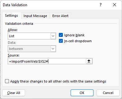 NOT(ISNUMBER(MATCH(Standings___Detailed_View[NFL Team.1],tbl_UserInput[Team],0))))Lastly, the syntax for the source of the dropdown list follows. Note the "#" at the end of the cell reference means it is referencing the entire dynamic array, as opposed to cell X2. I also disabled the "show alert..." on the Error Alert tab.