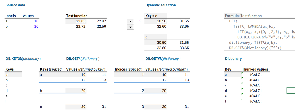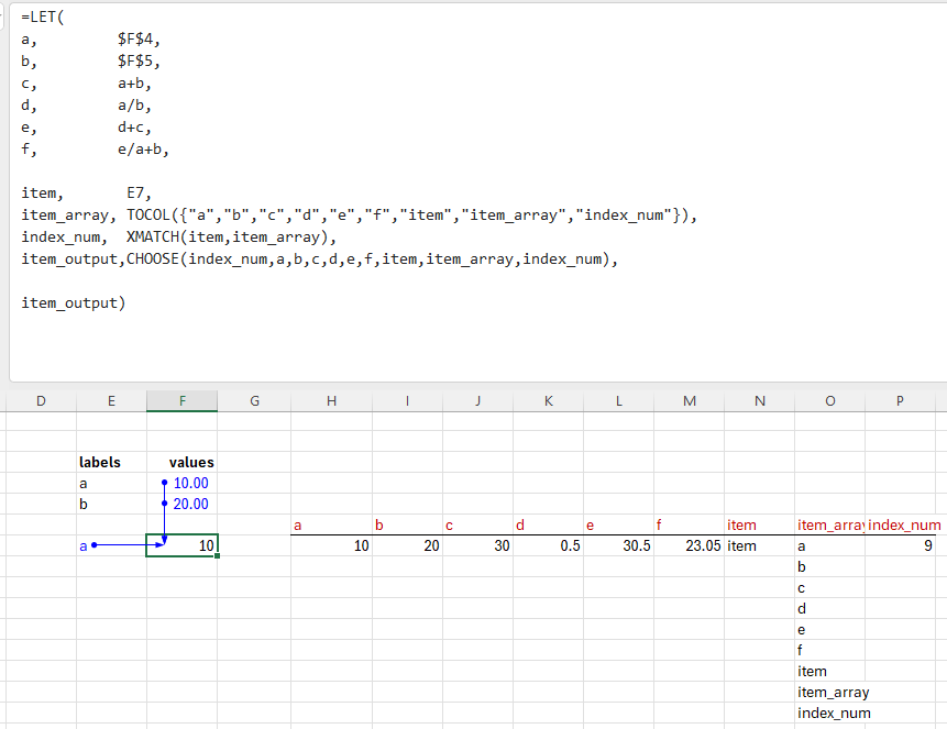 HSTACK(a,b,c,d,e,f,item,item_array,index_num)),"")) would indeed show each variable and value in excel but the use case I'm interested is slightly different.What the current version allows is you to point the LET formula to a cell that specifies the item you want and it returns what was define in the formula. Say you had a long calculation with lots of intermediate steps and you wanted to pull out just one of the outputs from the intermediate steps. This lets you do that easily. If I understand your formula, it returns all the variables and all the outputs rather than a specific one. I also think it requires retyping all the variable names in the cumbersome quotation and comma format which I've found prone to errors for my fat fingers. My formula has to type the variable names three times, first in the definitions, then as the text output of labels and then as the second argument in CHOOSE. It is error prone (missing comma, closed quote, typos, etc). Was trying to figure out a way to type it once and reference it.