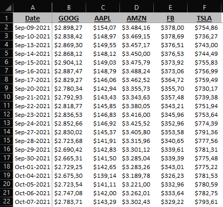 Below is a sample of 5 tech stocks quotes for the last 30 days that I pulled via STOCKHISTORY function. From the above data I need to create a TREND (LINE) CHART that starts with 100 so ...