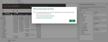X A operação na Tabela Dinâmica não foi realizada para que o conteúdo das células adjacentes não fosse sobrescritos
