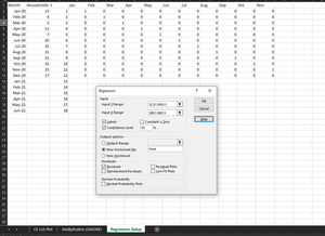 For linear regression, Excel will accept multiple independent X values but the result has to be a single Y value. In the posted screenshot there are 12 Y values for each X value.