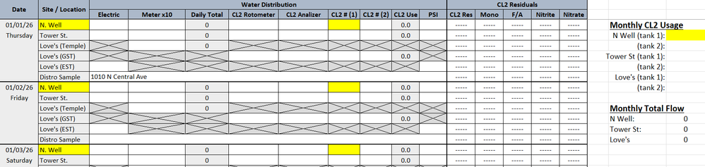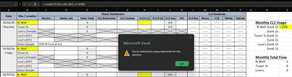 Happy Friday! I am trying to use the COUNTIF Function on a worksheet that tracks how much liquid chlorine is used at 3 different water wells each month, each well having 2 chlorine cylinders. I'm not sure if my brain is fried from reading/watching all kinds of videos for the past 3 hours and trying to follow their instructions, but any time I put in a formula, I get a pop-up saying I've entered too many arguments. Even if I enter individual cells and use only the 3 that it highlights for me (more than 3 does not highlight). I've attached a screen shot of the worksheet (Figure 1) and have highlighted the area I'm trying to figure out. As you can see, it will be for multiple dates, on multiple lines, going through to the end of the month, with the total chlorine (CL2) tallied up on the right hand side. Chlorine tanks are changed out quite often and each tank begins at 150, depleting down to 0. Figure 2 shows a screen shot of what I'm getting when trying to enter the formula. Am I misunderstanding how the formula works or am I using the wrong formula all together?