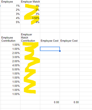 I need help creating a function that will generate the Employer match set amounts to rows below. Example, if Employee side shows 4% I need the next column to generate 3.5%.