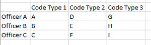 I am trying to write an equation that will pull the officer name using the corresponding code to match. Below are a mock up of the data that I am using.                        So what I need is a for...