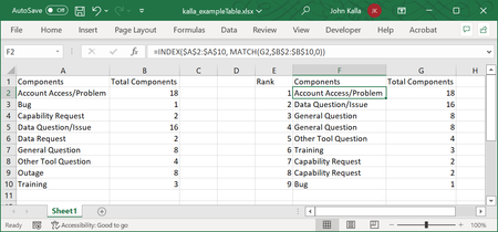 I'm trying to rank order entries using INDEX MATCH, and it's working, but when there are duplicate values, it only returns the first entry (note the duplicates "General Question" and "Capability Requ...