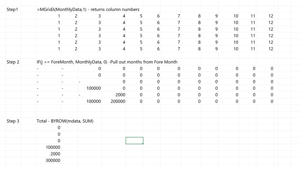 Use this dynamic spill formula for VOWD: =MAP(A2:A7, B2:M7, LAMBDA(fm, row, SUM(IFERROR(--TAKE(row, fm), 0)))) – MAP processes each row, fm is the Fore Month, row is the monthly data, TAKE(row, fm) picks the first fm months, IFERROR(--…,0) converts any "-" to 0, and SUM adds them. It spills automatically, sums the first N months per Fore Month, and needs no helper columns.