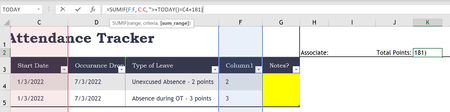 Excel Attendance Formula Help: Sum of attendance points for all dates w/in 6 months of infraction