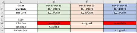 Determining which date ranges the staff member is unavailable for, and changing those cells to "Unavailable" + red is just part of the logic needed. While it might be possible with lengthy formulas, this situation calls for VBA code and a macro-enabled worksheet (though using code does mean you must think about security). I have written VBA code to do that determination. But beyond that requirement, think through these: