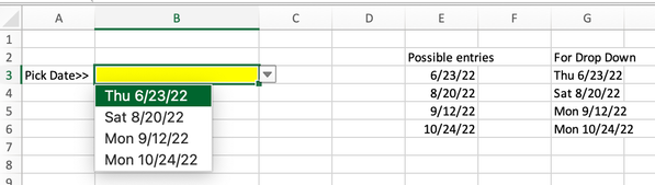 IF you are working in fact with a limited set of dates, say for the next two months, and workdays only (or weekends only)...I've created a fancier version of the drop down that includes the day of the week as well as the date. It now looks like this:
