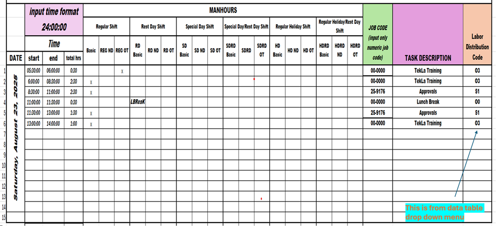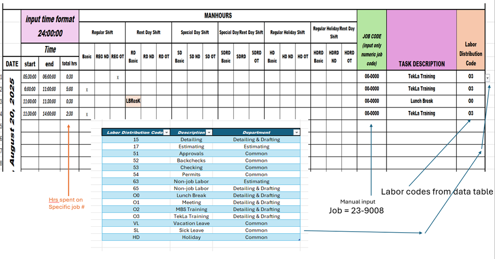 first input the actual time to calculate the spent hrs then the job# then the labor code from the data table's drop down menu. from here this is where i will generate the report image i sent to you yesterday