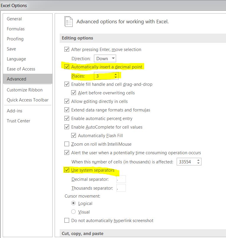 - JMB17Nov 14, 2020Bronze ContributorFor one thing, you need to uncheck "Automatically insert a decimal point" under Excel's advanced options. That will cause 250 to become 0.250.