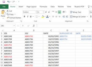 Okay, I have to hard type the formula and not just copy your formula and paste it. Also, I dragged each formula down and I got the result which is cool. The only problem I am having now is when I'm sorting it, either in Column E or D, the dates are off? I am comparing the dates from the original and somehow some dates are showing up on ID 2 where there shouldn't be any date at all.
