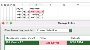 The value of this column is estimated by the entry day on a previous column+62. I have created this already works fine. I need to be able to flag up the date of the next column R ( definite treatment day) if this day is AFTER the date given in Day 62 column. Ideally by changing cell colour. So practically if i enter 08/12/22 in R2, because this is after 06/12/22 in S2 the cell R2 needs to flag ie by changing to a given colour. So R<S. I have found ways to make it flag on a given date but not on changing dates. Any ideas please?