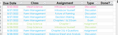 I am trying to make an excel to help keep up with my college work. I want to use conditional formatting to show what I have done, started, or not started. Is there a way to make one conditi...