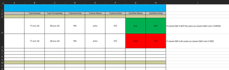 Please help with conditional formatting rules. In our unit the trainer can not be the same as the certifier. I manually colored it to what I wish to see. Thank you a TON in advance!!