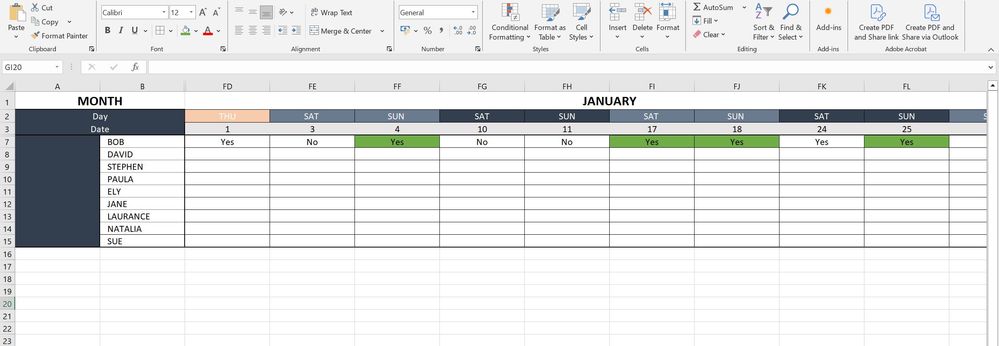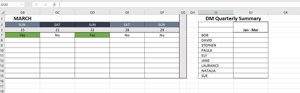I would like to be able to count the number of cells that contain a specific value and are shaded a specific colour. This is for a rota spreadsheet that will be tallying the total number of shifts which have been agreed. The cells that contain "Yes" as a value from a drop down list and are shaded green, should be counted as part of the quarterly total.