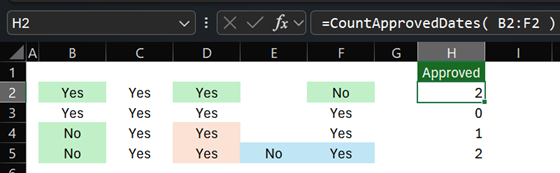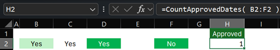 Counts cells in range where cells value = yes and cells RGB Hex color <> FFFFFF