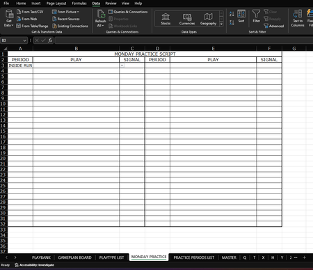 In the sheet called "MONDAY PRACTICE" in cell B3 I am trying to create a drop down list. I want this list to be filtered down based on a couple of other criteria. The first criteria is based on c...