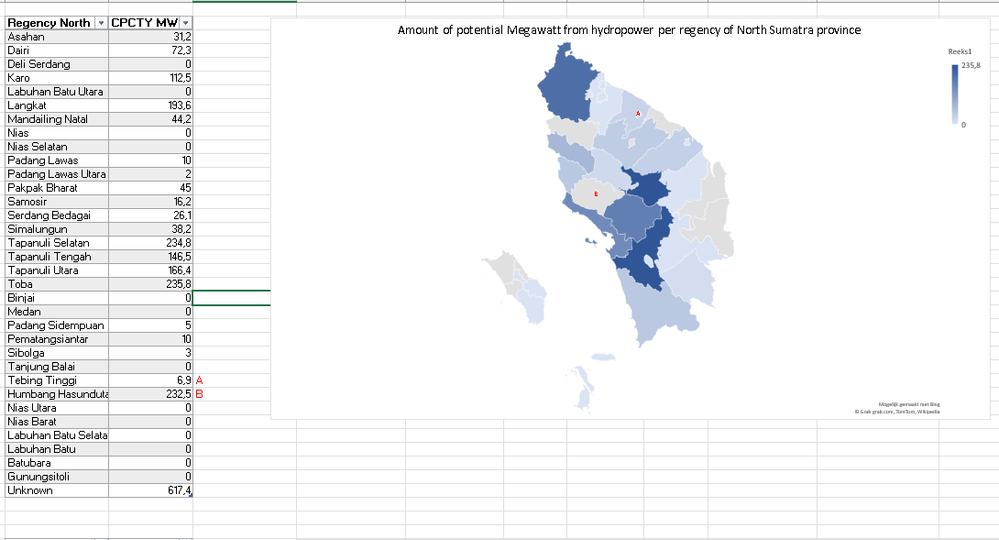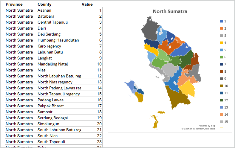 I am working in excel and have to make a map like this about every province in Indonesia. Unfortunately Excel does not reconize every regency, but it's written in the right way. (So he does not select those gray boxes) Does anyone have a tip what I can do?