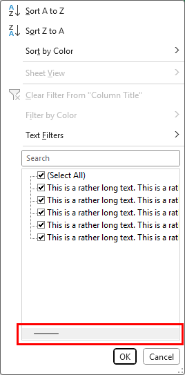 A filter drop-down box displays a horizontal scrollbar if necessary:
