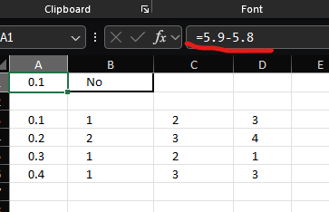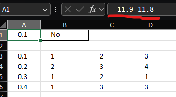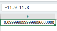 Excel has limited digits of resolution and 11.9-11.8 hits that:
