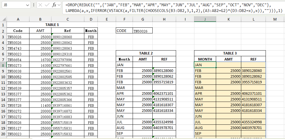=DROP(REDUCE("",{"JAN","FEB","MAR","APR","MAY","JUN","JUL","AUG","SEP","OCT","NOV","DEC"}, LAMBDA(a,x,IFERROR(VSTACK(a,FILTER(CHOOSECOLS(B3:D82,3,1,2),(A3:A82=G2)*(D3:D82=x),x)),""))),1)
