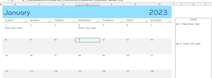 Hi, I am trying to create a simple calendar template where the calendar events populate in a separate column. So if there is a calendar event on January 1, I would like for the event list to populate...