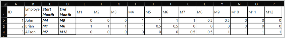 | 1 | ID | Employee | Start Month | End Month | M1 | M2 | M3 | M4 | M5 | M6 | M7 | M8 | M9 | M10 | M11 | M12 |