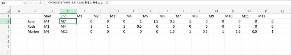 The result I'm looking for is for John - Start M4, End M9; Brian - start M1, End M6; Alison - start M7, End M12 .. i.e. its linked to non-zero cells