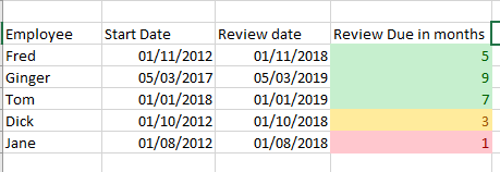 2. i would like to have the cells colour coded for the annual review; so if the review is due in more than 4 months its green, 2-4 months its yellow, less than 2 months red
