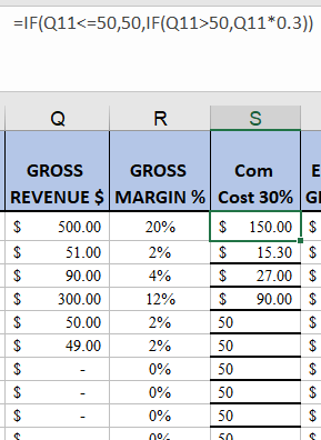 I am having a problem with a formula designed to calculate a commission rate that is taking 30% of the gross revenue. There is a minimum amount of $50 if the gross revenue is $50 or less. My formul...