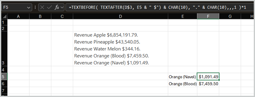 =LET(start,FIND("Navel",A1)+8,lngth,FIND("Revenue Orange (Bl",A1)-(start+2),VALUE(MID(A1,start,lngth)))